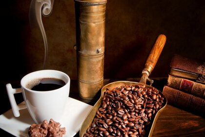 Tasse dunkler kaffee aus dem korn und in einem löffelTasse dunkler Kaffee aus dem Korn und in einem Löffel