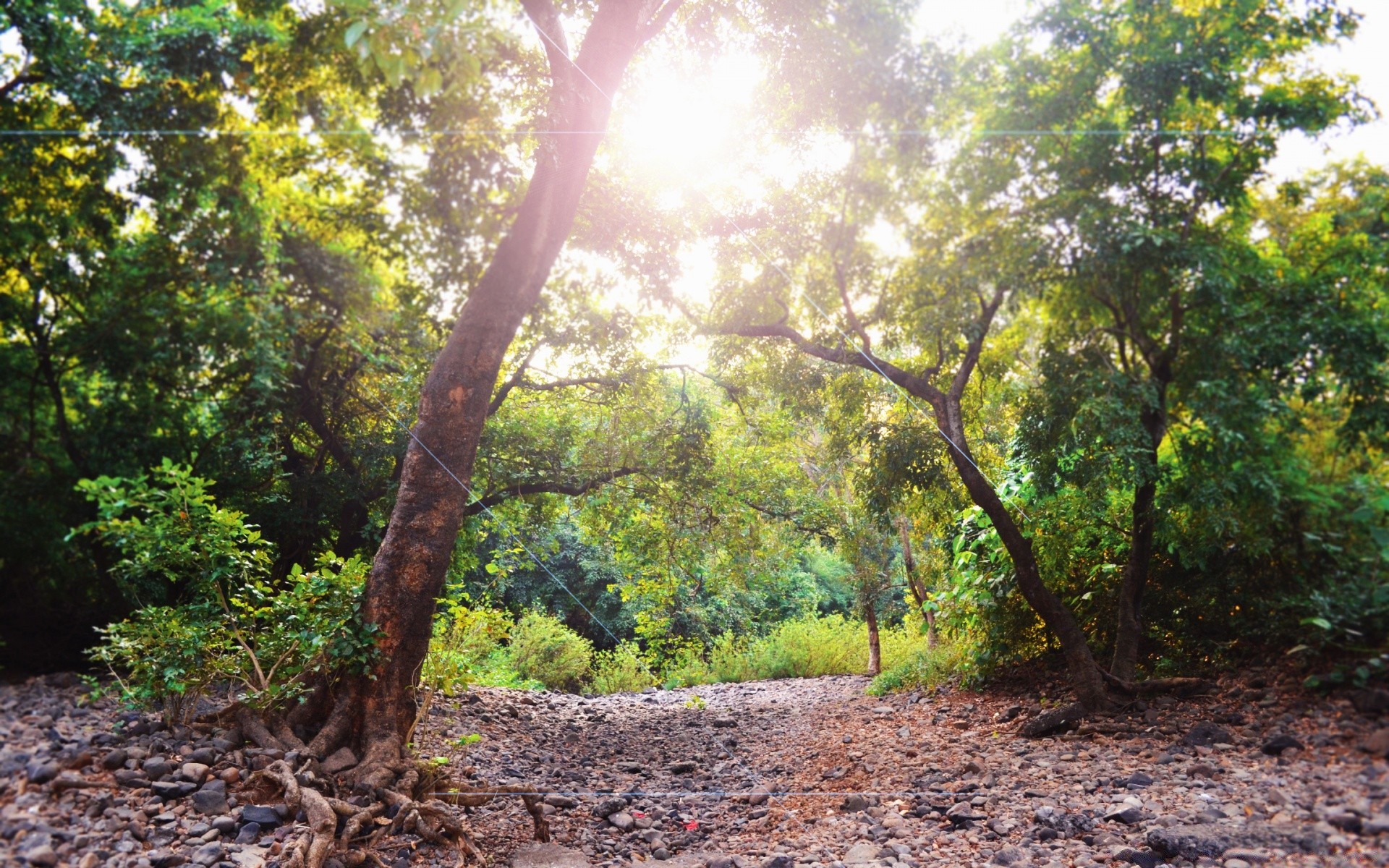 Alter Mann mit Bart und Stab vor dem Hintergrund der Berge im Nebel