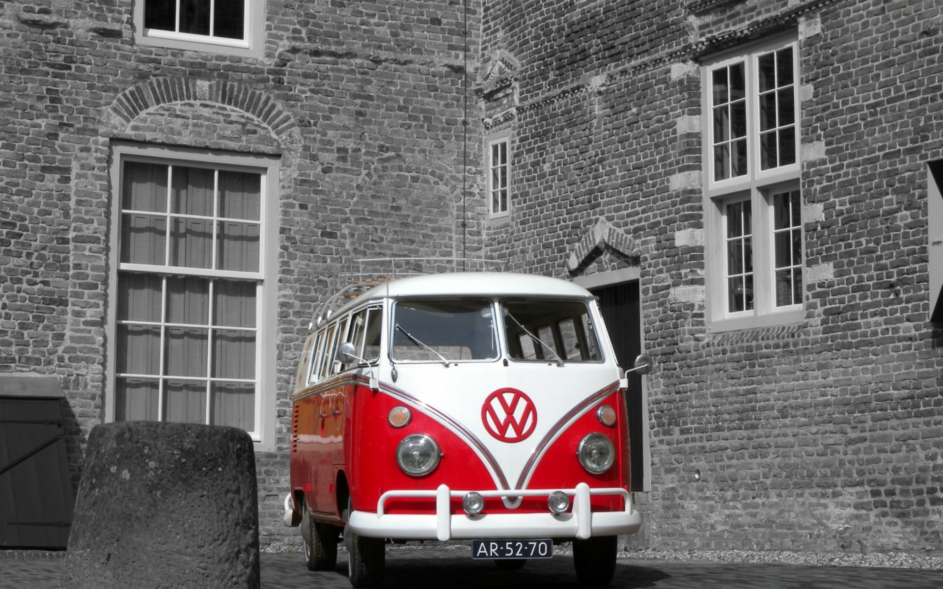Alter roter Bus auf dem Hintergrund eines grauen Gebäudes