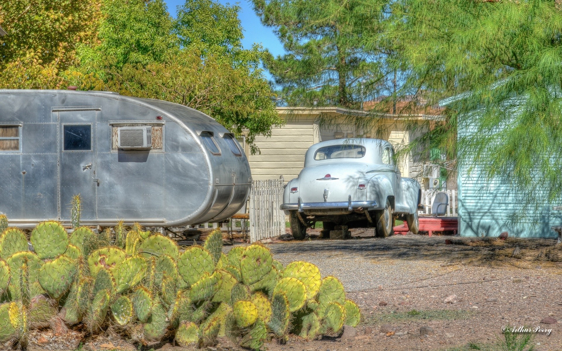 Kakteen, ein altes Auto, ein Wohnwagen, lernen den Boden