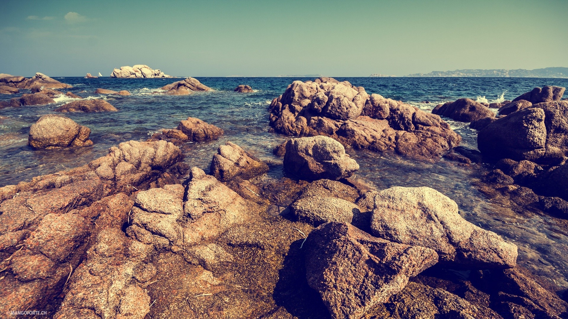 Ruhiges Meerwasser am steinigen Ufer unter blauem Himmel