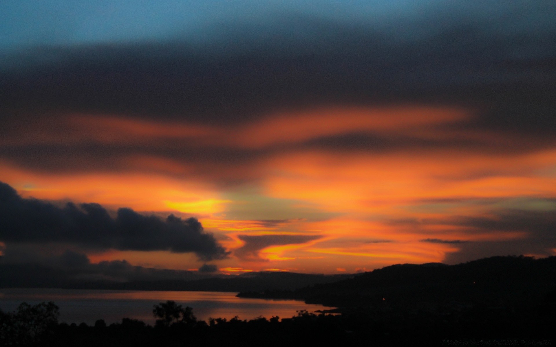 Sonnenuntergang und Sonnenaufgang am Abend über dem Wasser des Sees
