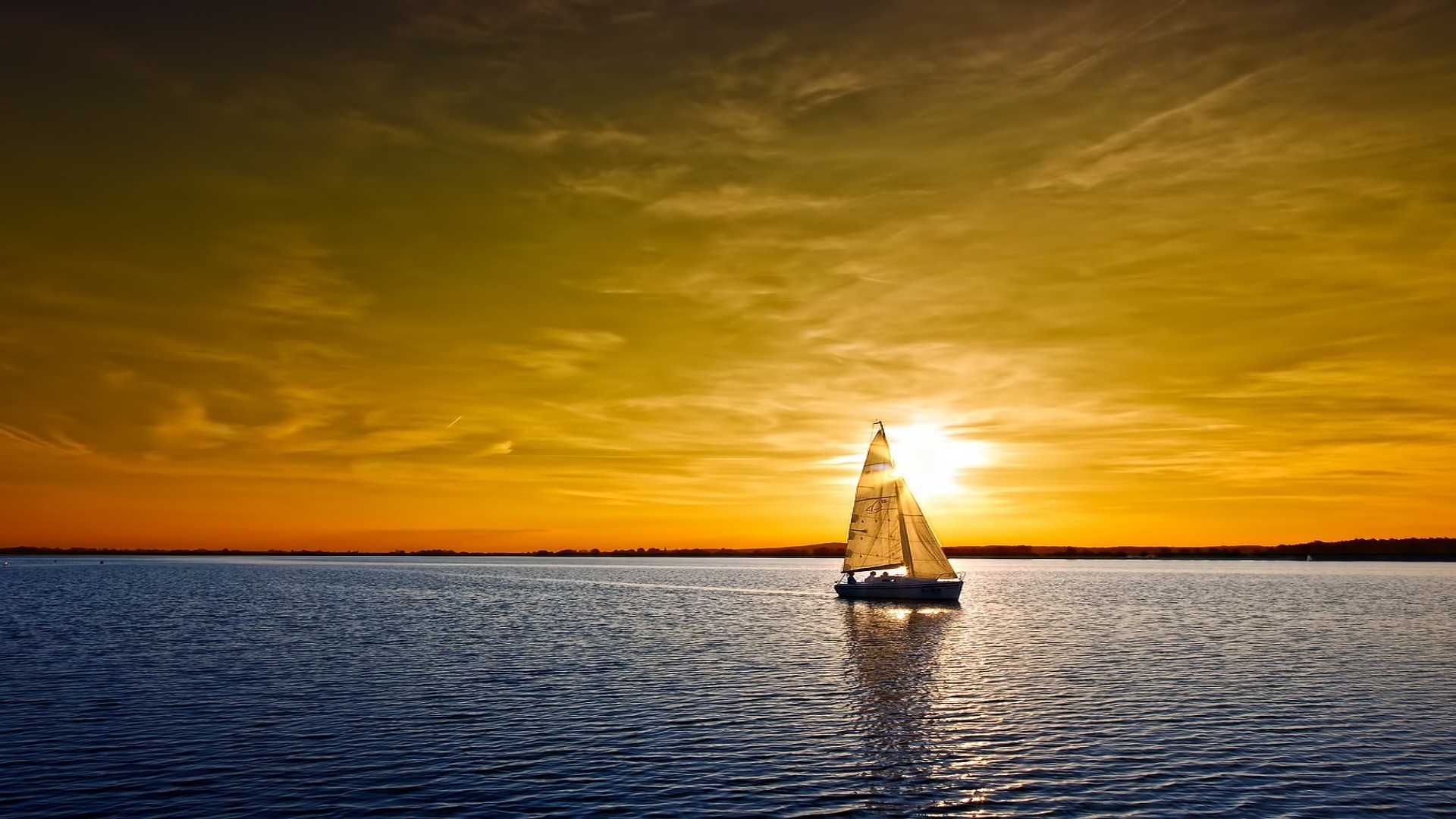 Das Schiff verlässt den Sonnenuntergang am Meer
