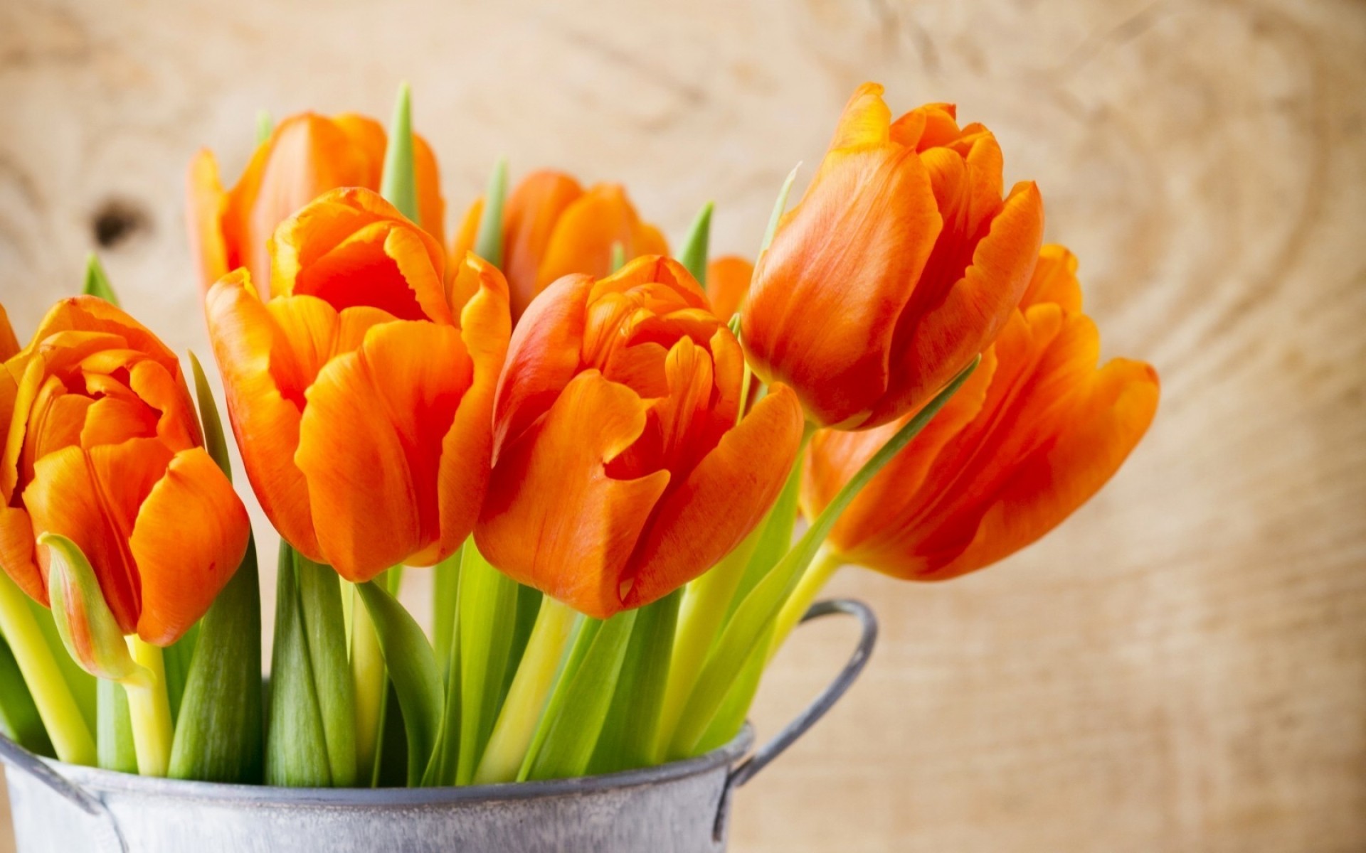 Orange Tulpen im Eimer am hölzernen Hintergrund