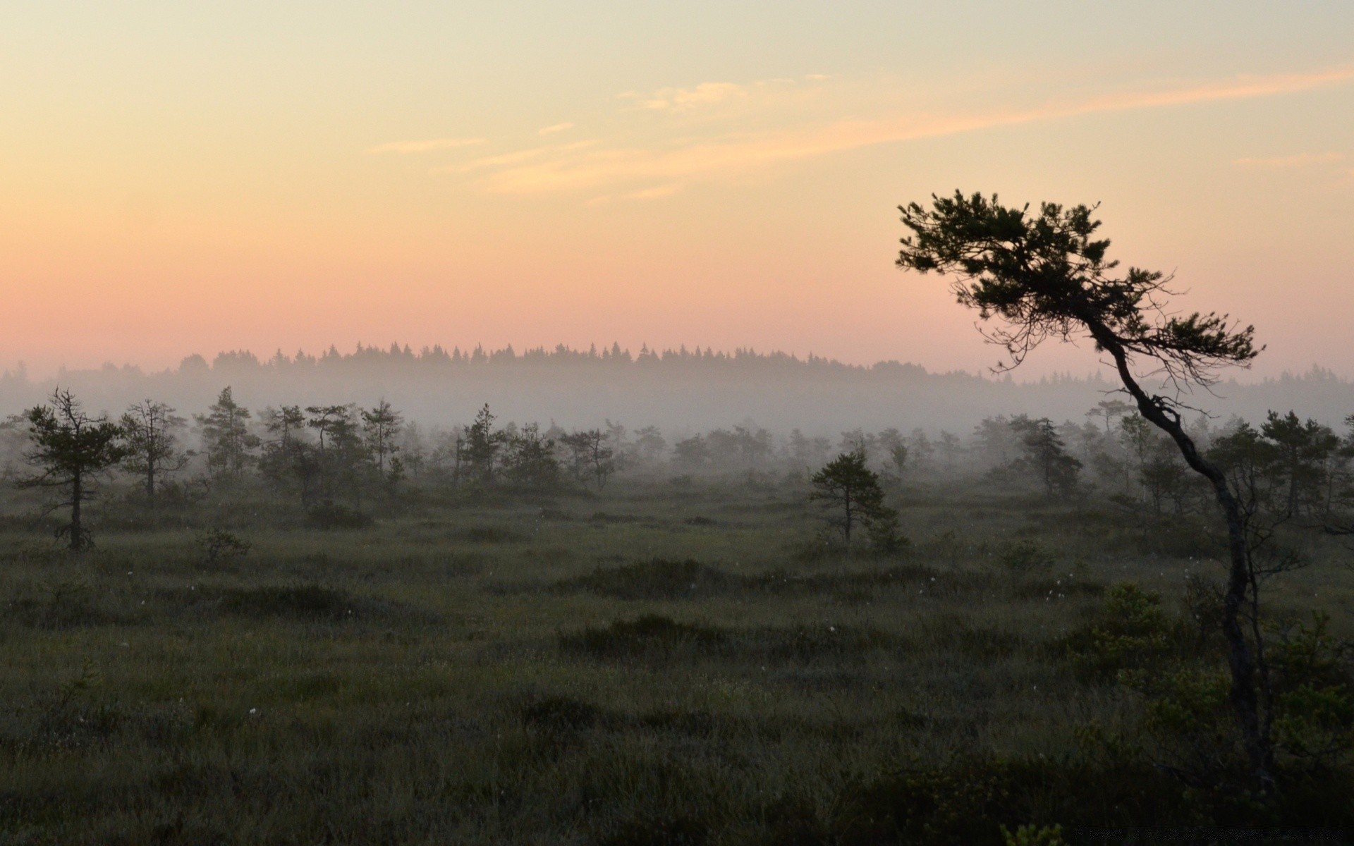 Einzelne Bäume vor dem Hintergrund eines nebligen Waldes am Morgen