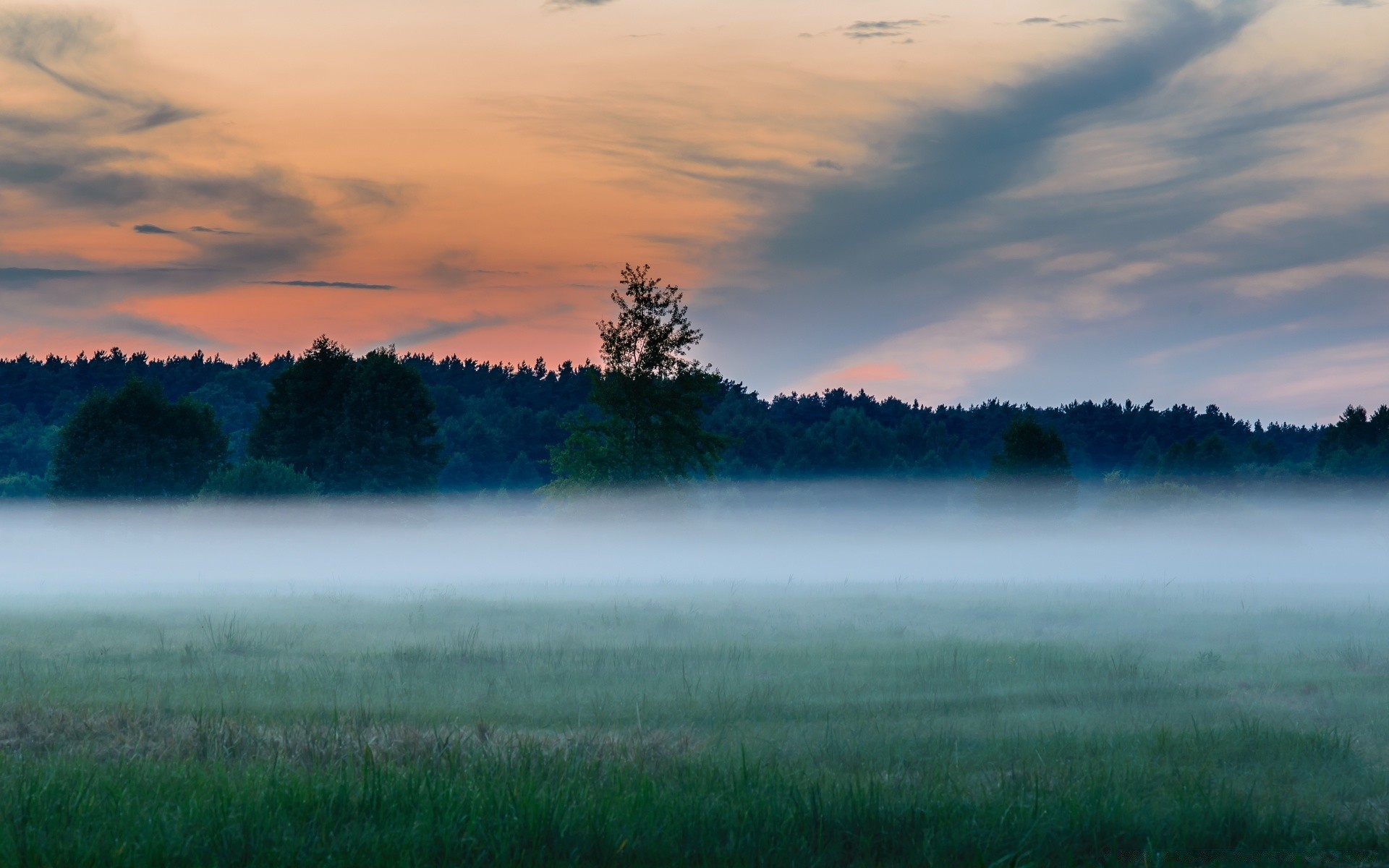 Landschaft der morgendämmerung mit nebel am morgenLandschaft der Morgendämmerung mit Nebel am Morgen