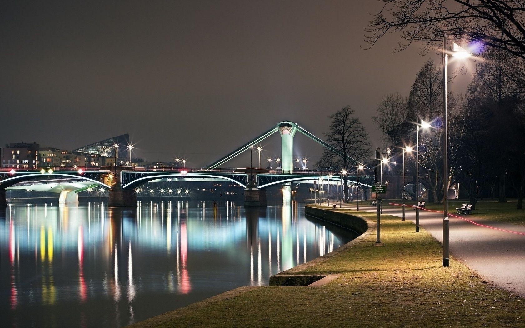 Helle Abendstadt am Wasser. Mit schicken Gebäuden