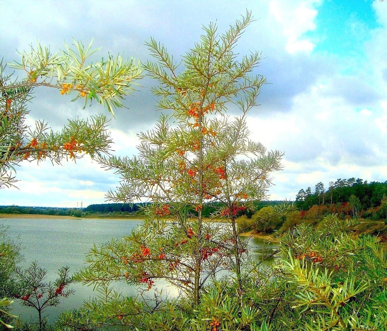 Sanddorn am Ufer eines ruhigen Sees