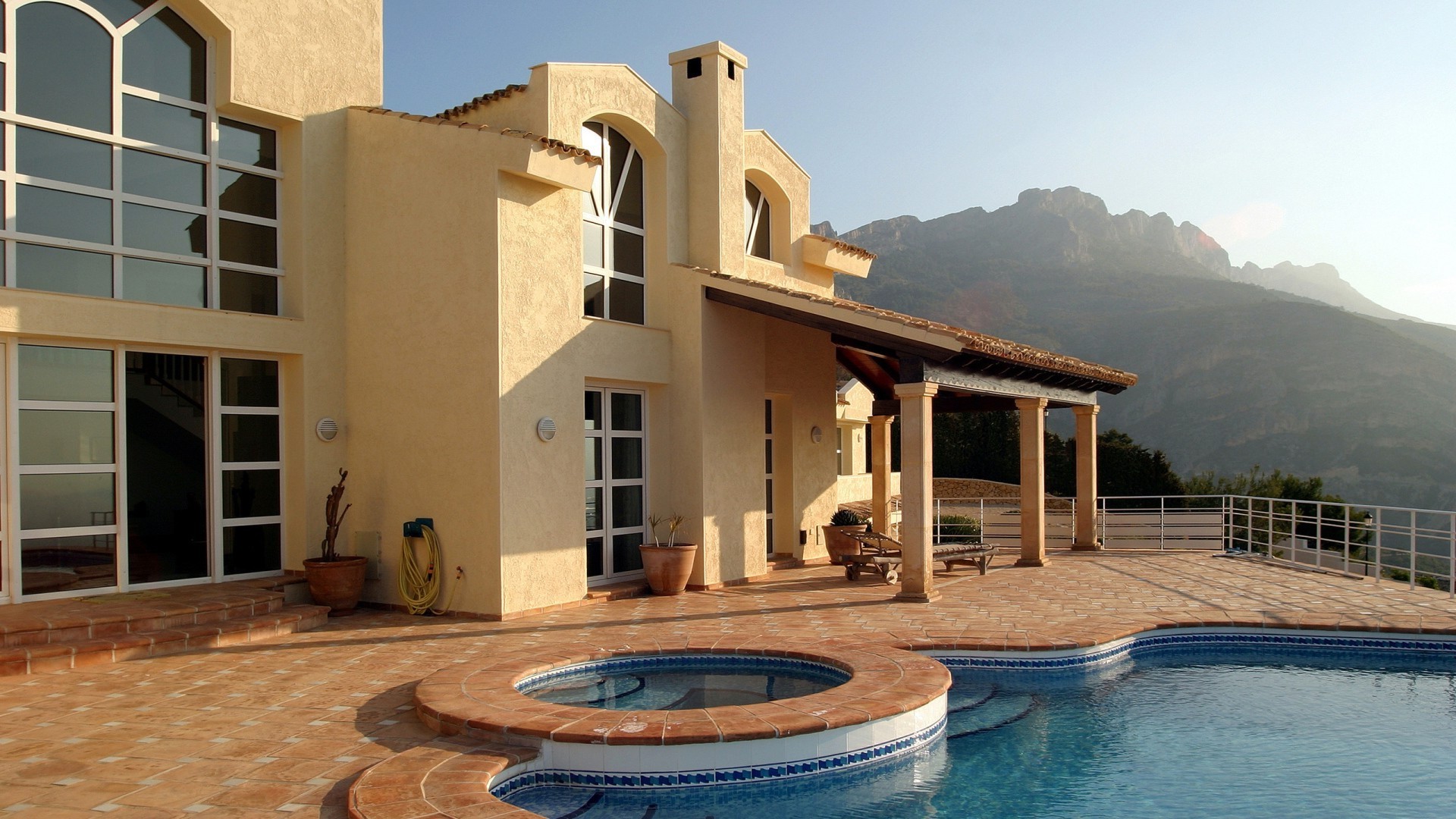 Ein riesiger Pool inmitten von Wolkenkratzern vor dem Hintergrund des Himmels mit Wolken