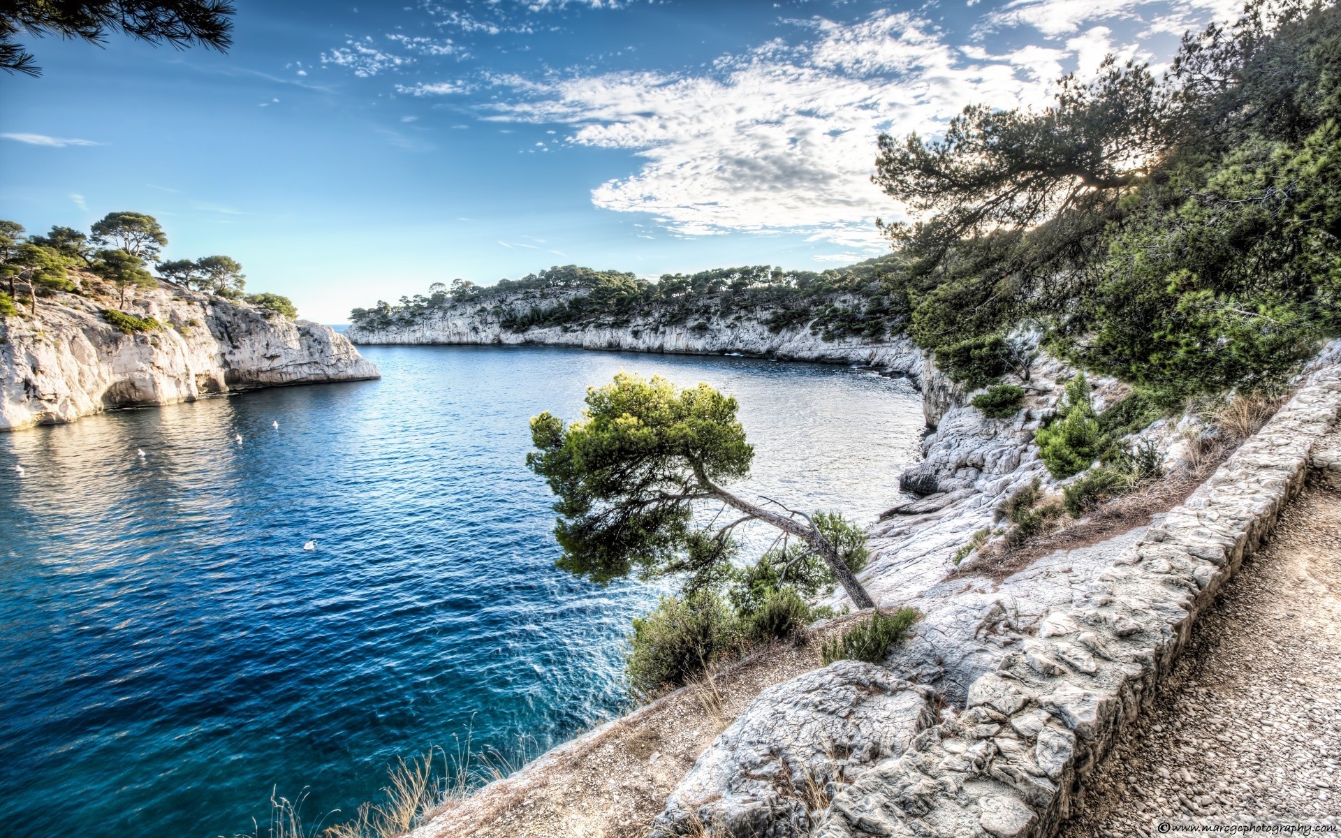 Am Morgen sitzt ein fröhlicher Angler am Meer