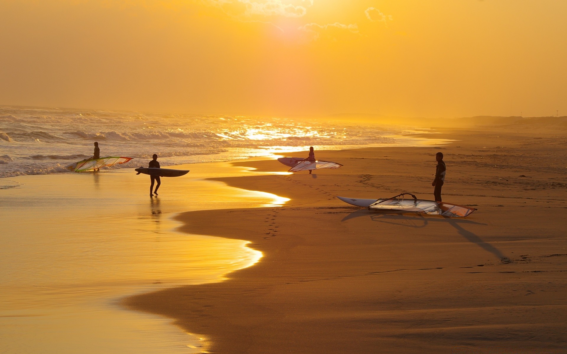 Menschen mit surfern am strand eines sonnenuntergang-sandstrandes