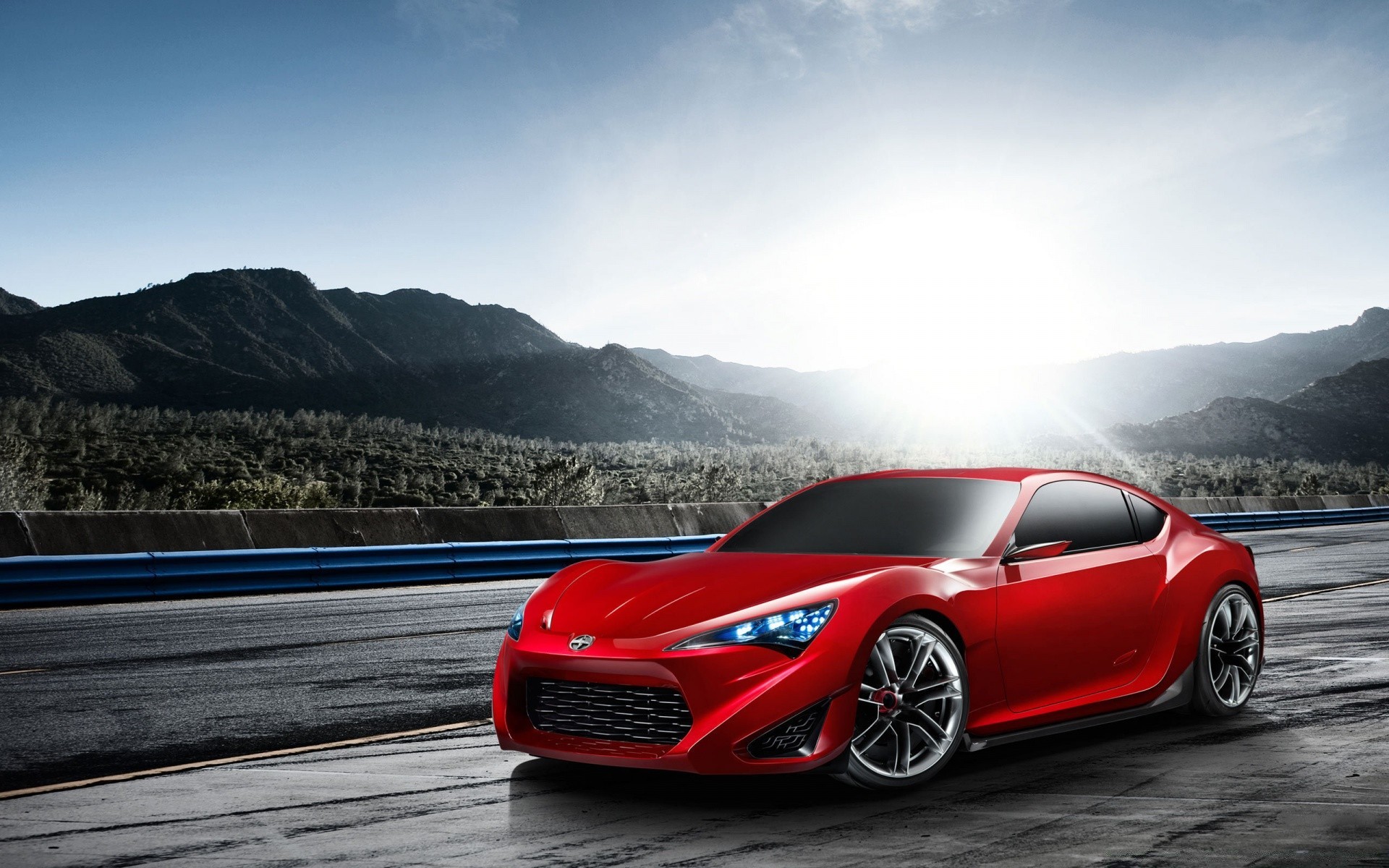 Schönes rotes Auto auf dem Hintergrund der Berge