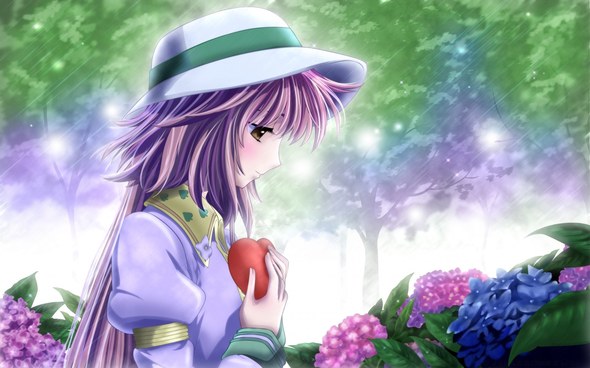 Anime Mädchen stehen im Garten mit Herz