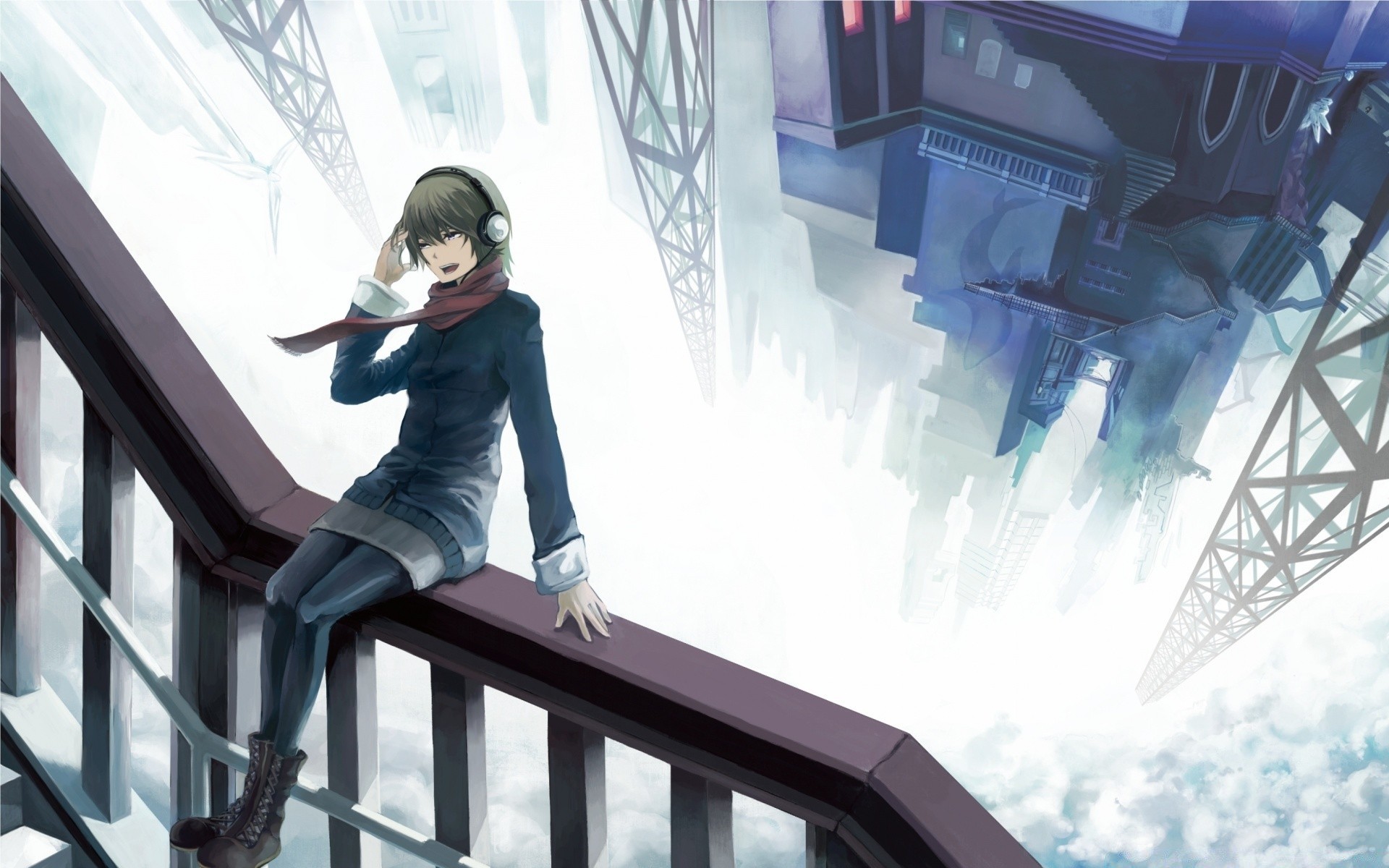 Anime-Mädchen in Kopfhörern sitzt auf einem Geländer vor dem Hintergrund des technologischen Fortschritts