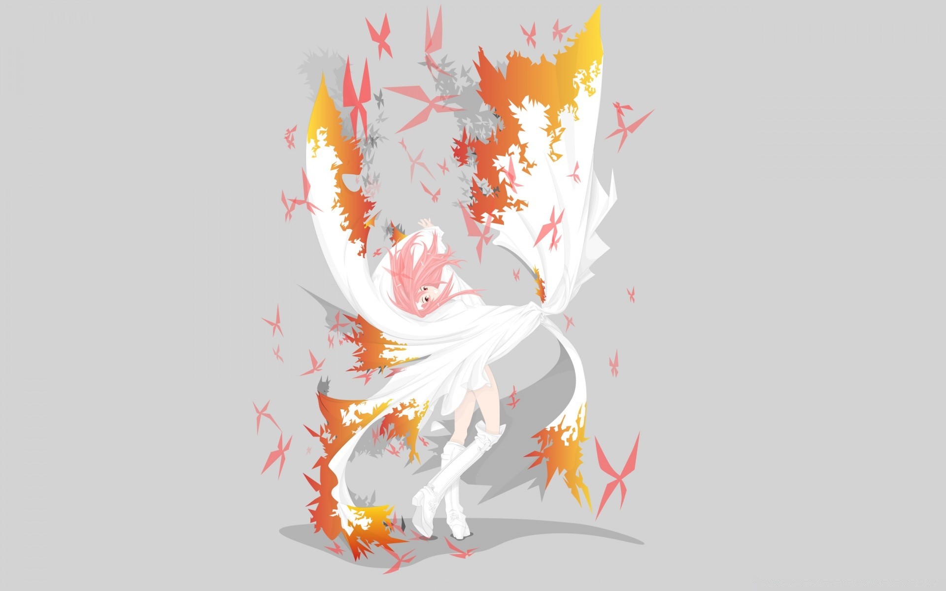 Mädchen mit rosa haaren in einem weißen kleid mit anime-schmetterlingenMädchen mit rosa Haaren in einem weißen Kleid mit Anime-Schmetterlingen