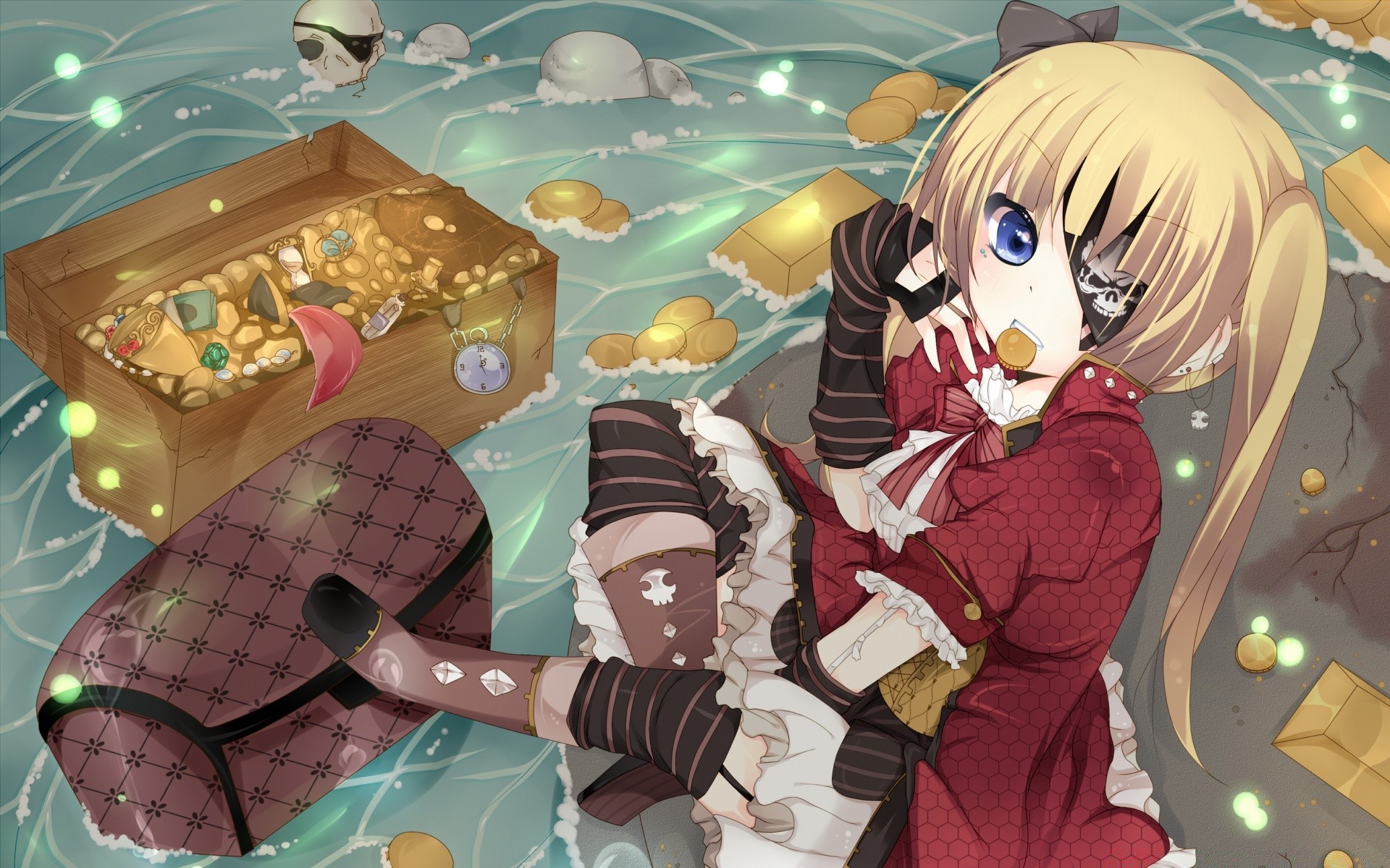 Anime blonde Piraten in der Nähe der Schatztruhe