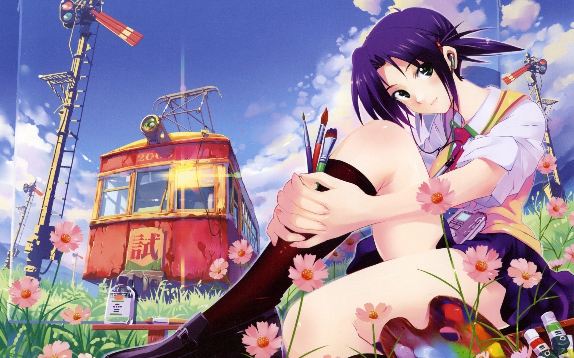 Die Anime-Heldin sitzt inmitten von Blumen im Gras, mit Pinseln, einer Palette und Farben, neben einer roten Straßenbahn