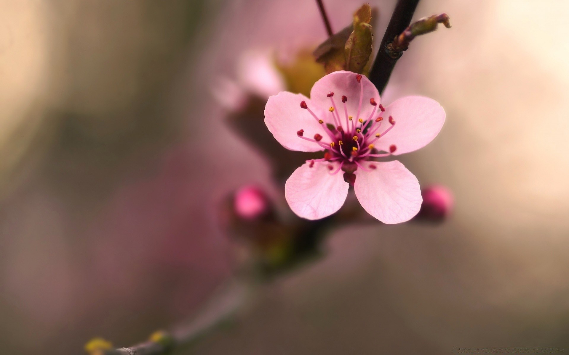 Makro-Kamera. Rosa zarte Blume auf einem Zweig