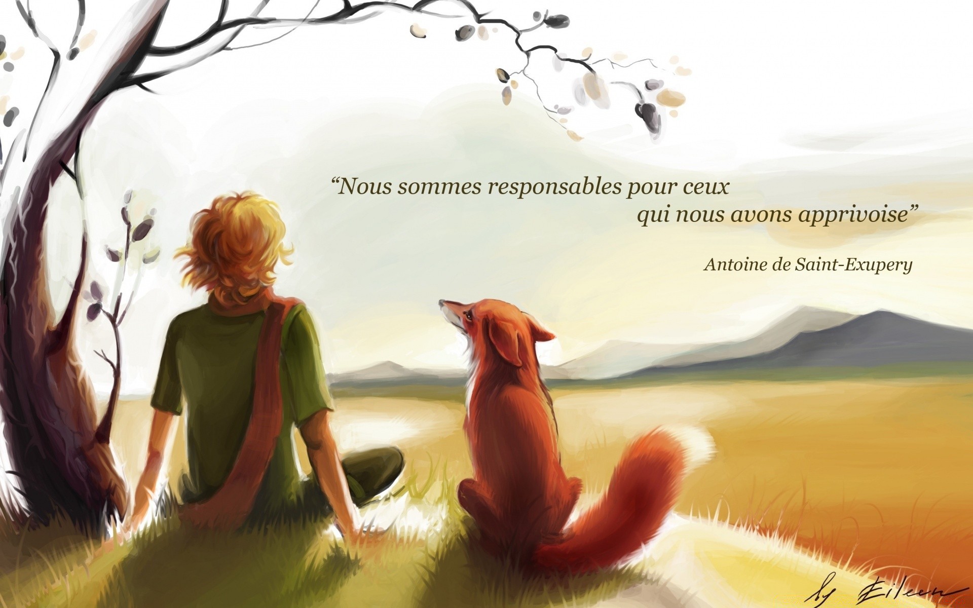 Ein Kind mit einem Fuchs sitzt auf einer Wiese