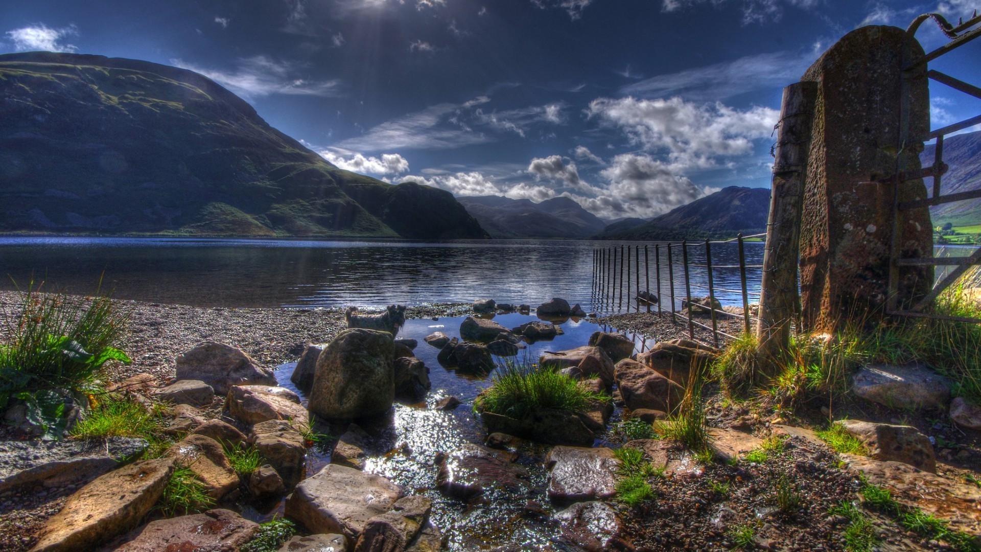 Aus dem Fluss ragt ein Denkmal in Form eines Silberfischschwanzes vor dem Hintergrund des untergehenden Mondes und der Nachtstadt heraus