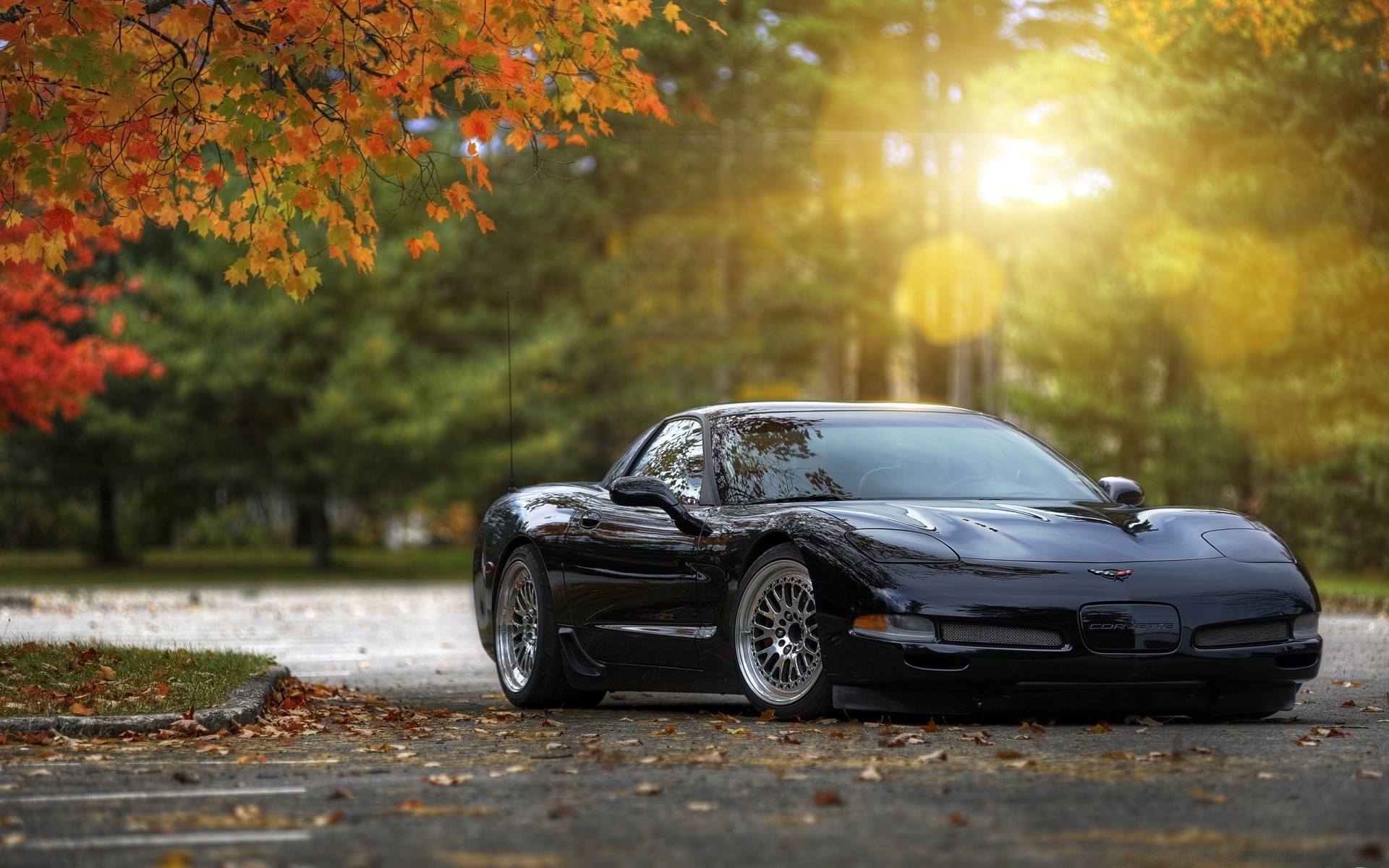 Schwarzes auto auf dem hintergrund der herbstlichen bäumeSchwarzes Auto auf dem Hintergrund der herbstlichen Bäume