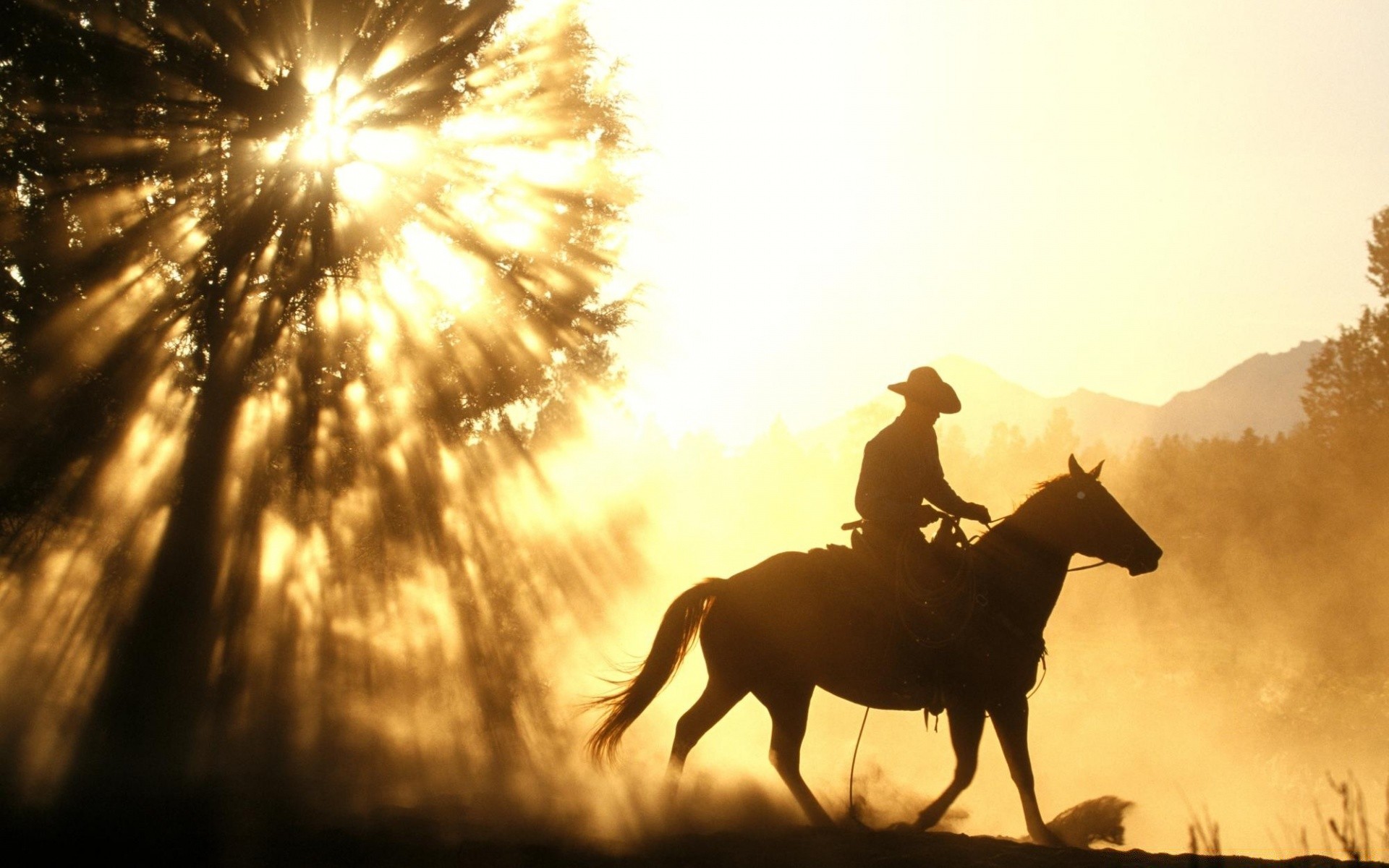 Ein Überfallfahrer reitet in der Sonne auf einem Pferd
