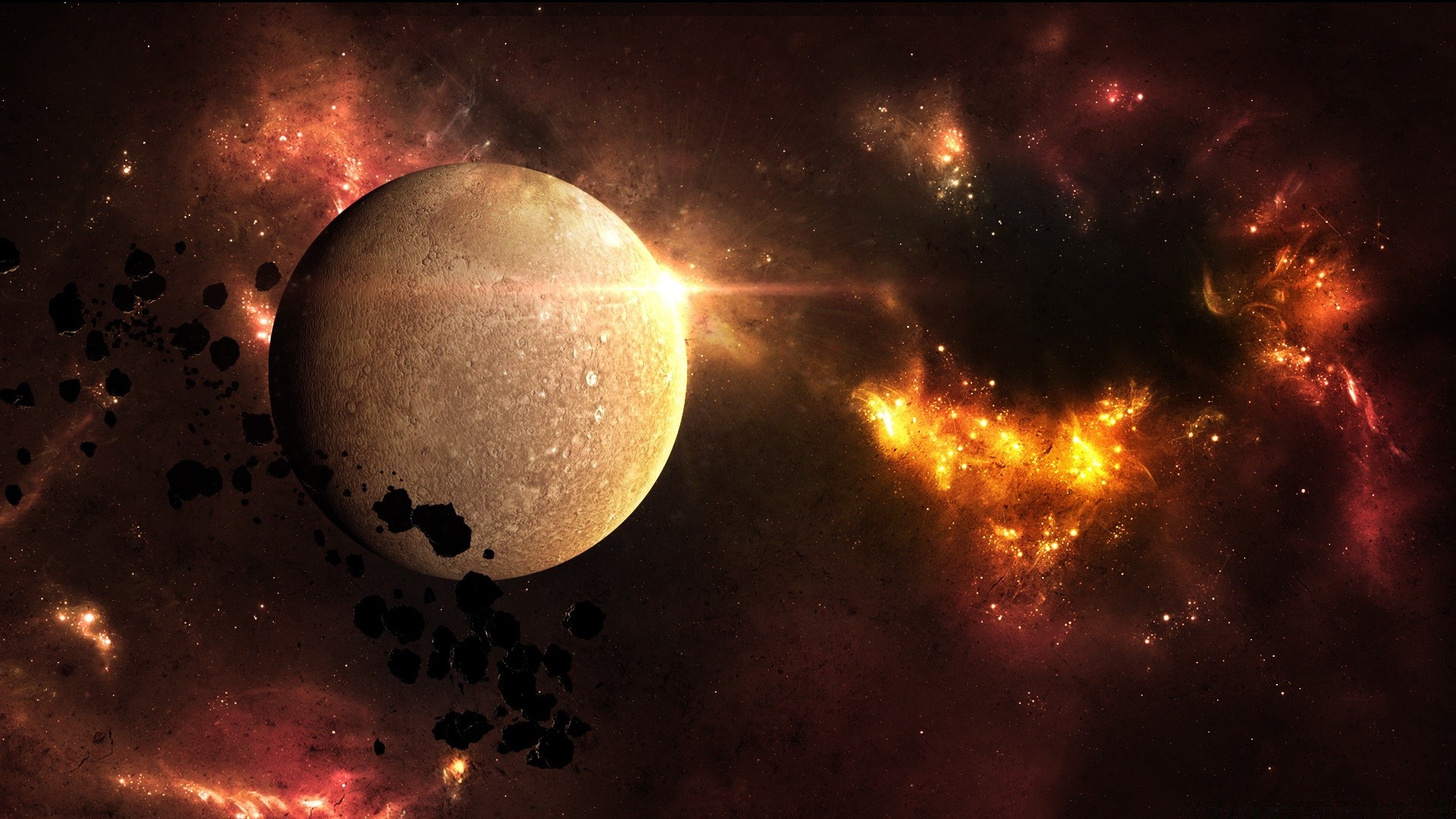 Planeten vor dem Hintergrund brennender Galaxien