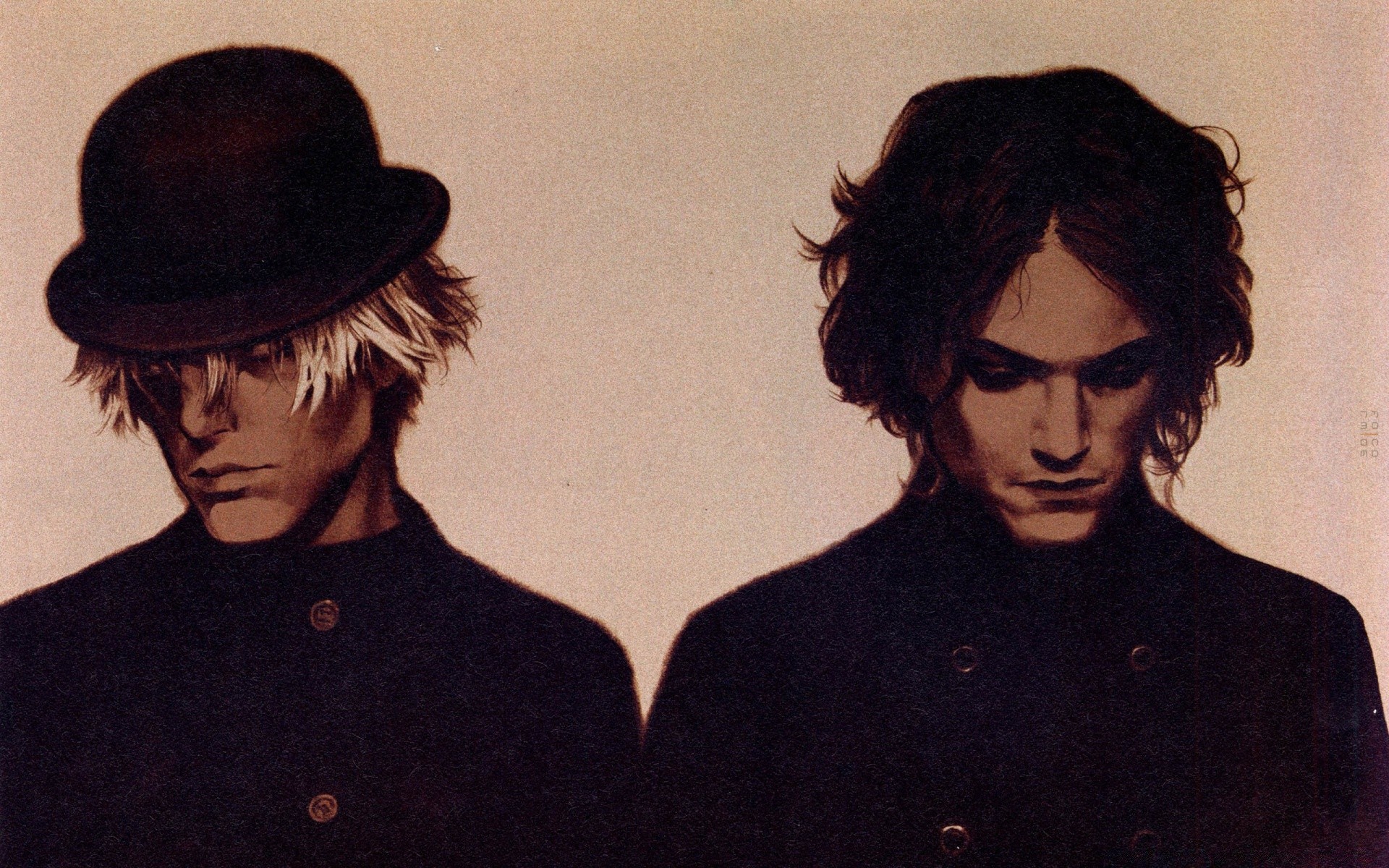 Beatles-Gruppe mit Musikinstrumenten vor dem Hintergrund eines alten, zerfallenen Autos