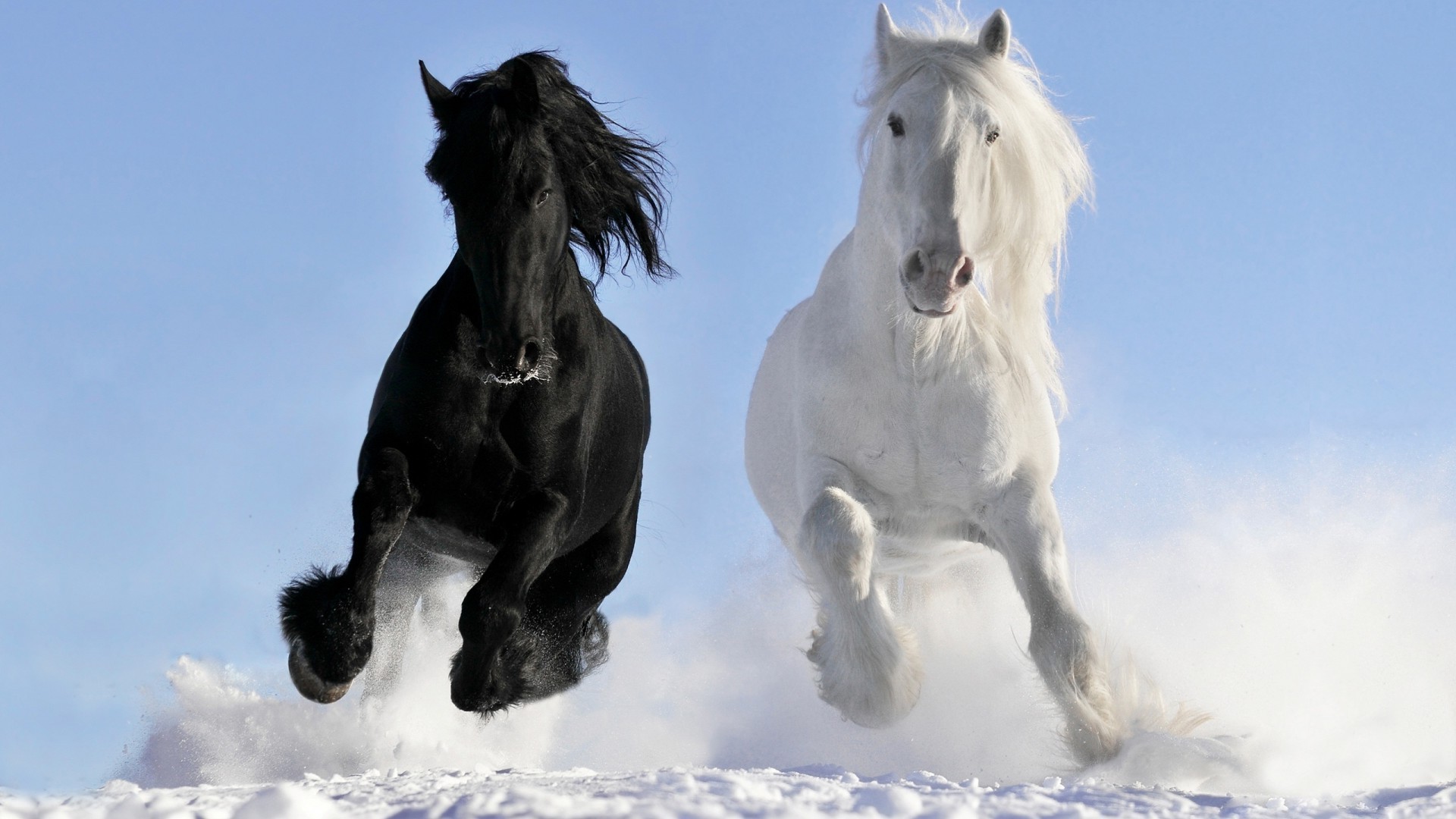Zwei Pferde reiten im Winter auf Schneewehen