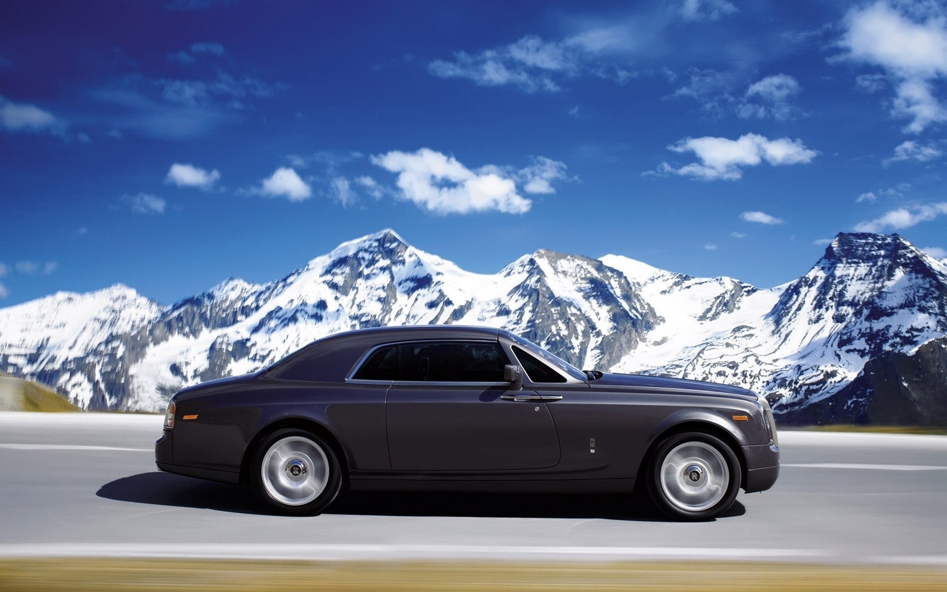Auto rast auf der straße vor dem hintergrund von schneebedeckten gipfelnAuto rast auf der Straße vor dem Hintergrund von schneebedeckten Gipfeln