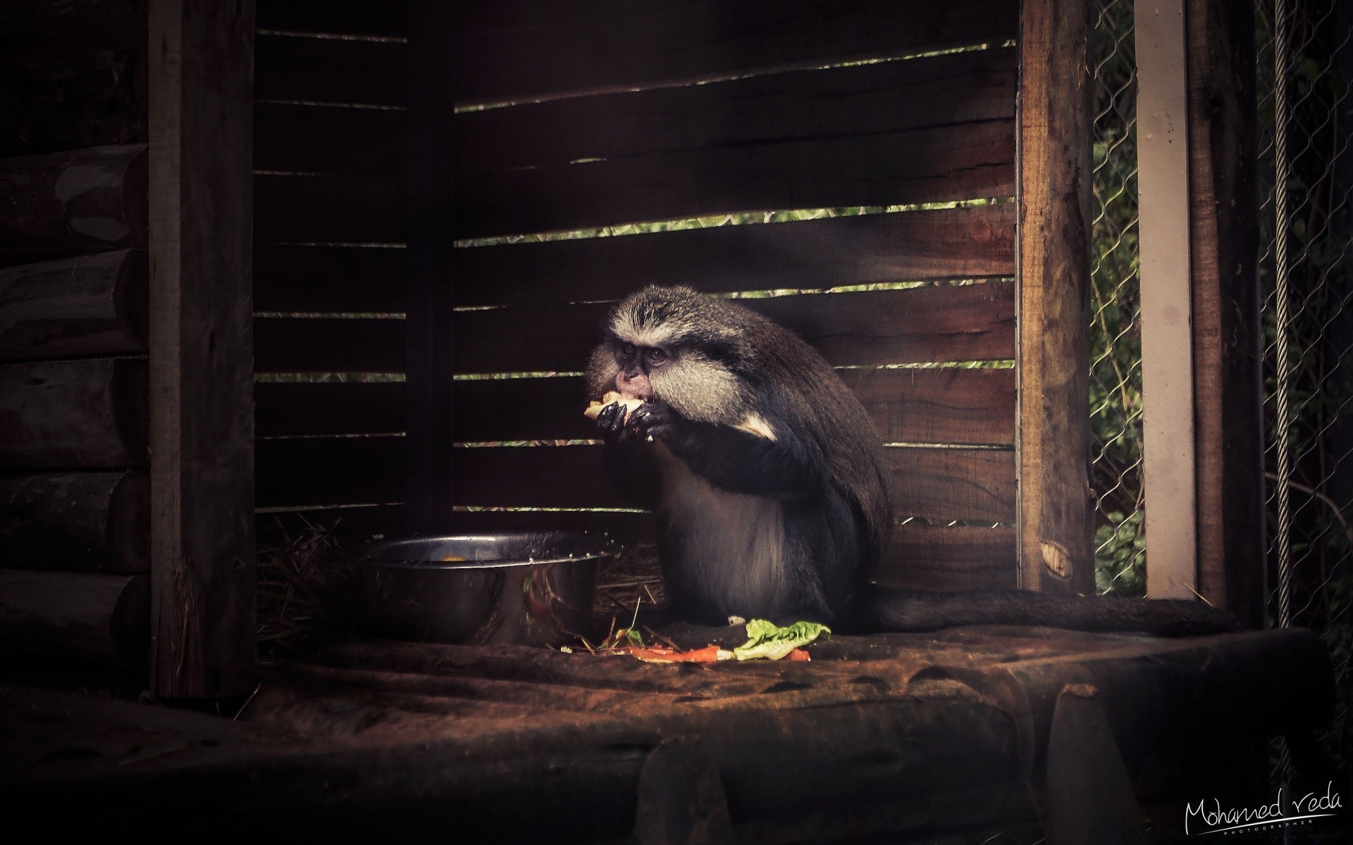 Affe ernährt sich in Gefangenschaft aus einer Schüssel