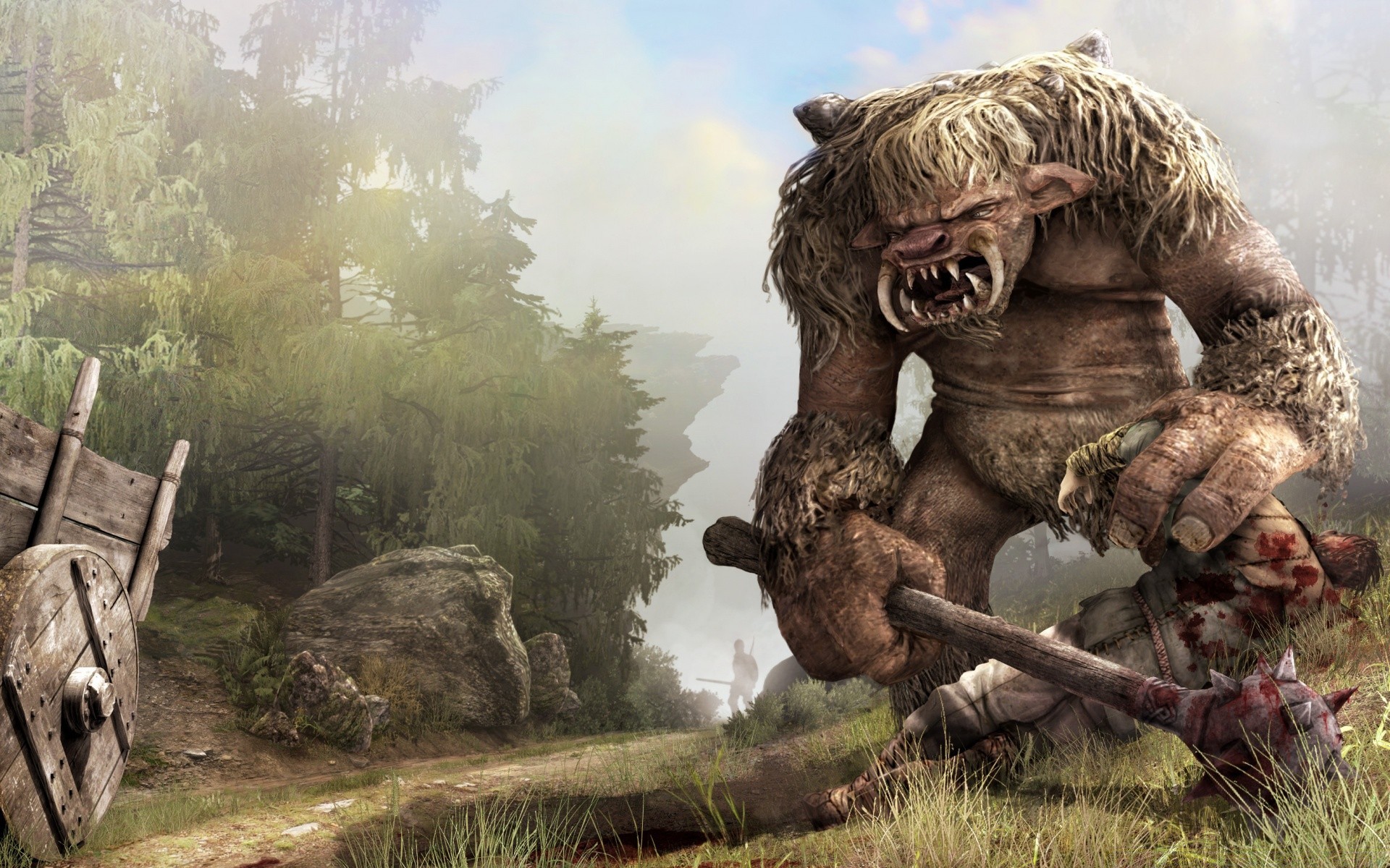 Ein Bild aus einem Computerspiel mit einem Bild eines Riesen mit einem Hammer
