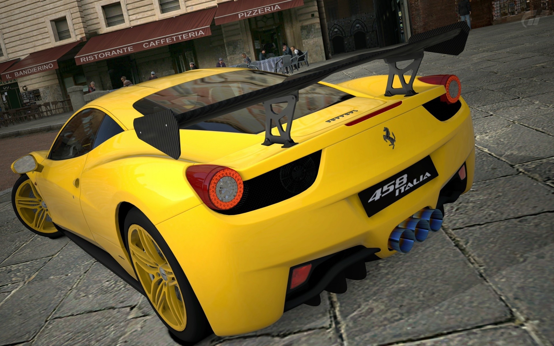 Ein gelber Ferrari-Rennwagen in einer alten Stadt im Computerspiel gran turismo