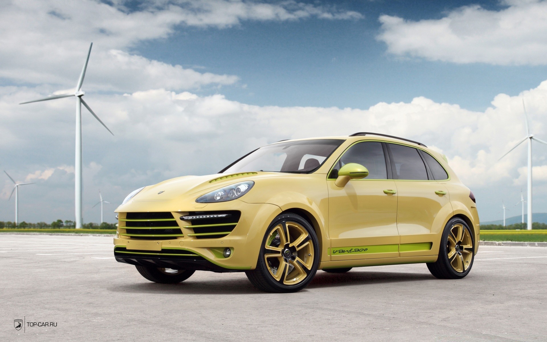 Gelbes Auto auf dem Hintergrund von Windrädern