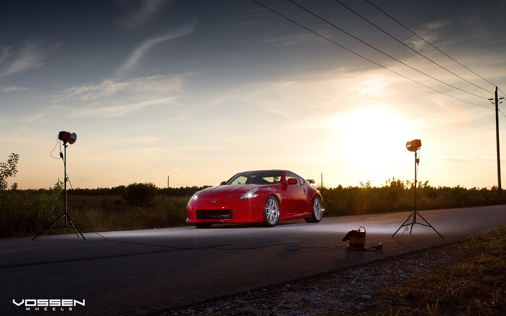 Schickes Auto auf der Straße bei Sonnenuntergang