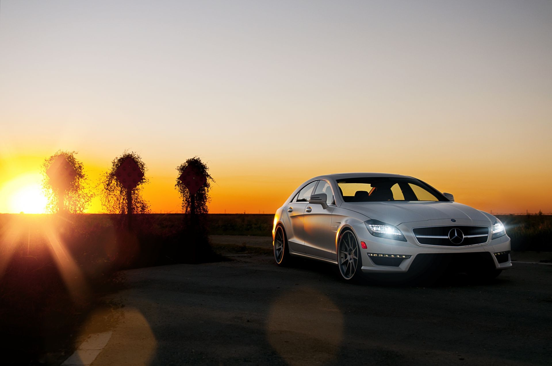 Graues Auto auf Sonnenuntergang Hintergrund und drei Bäume