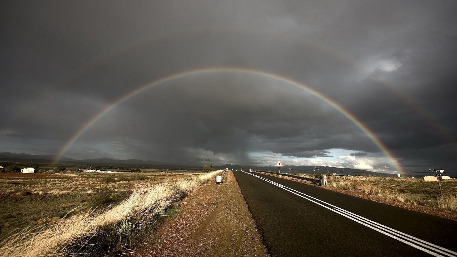 Doppelter Regenbogen auf einem düsteren Himmelshintergrund