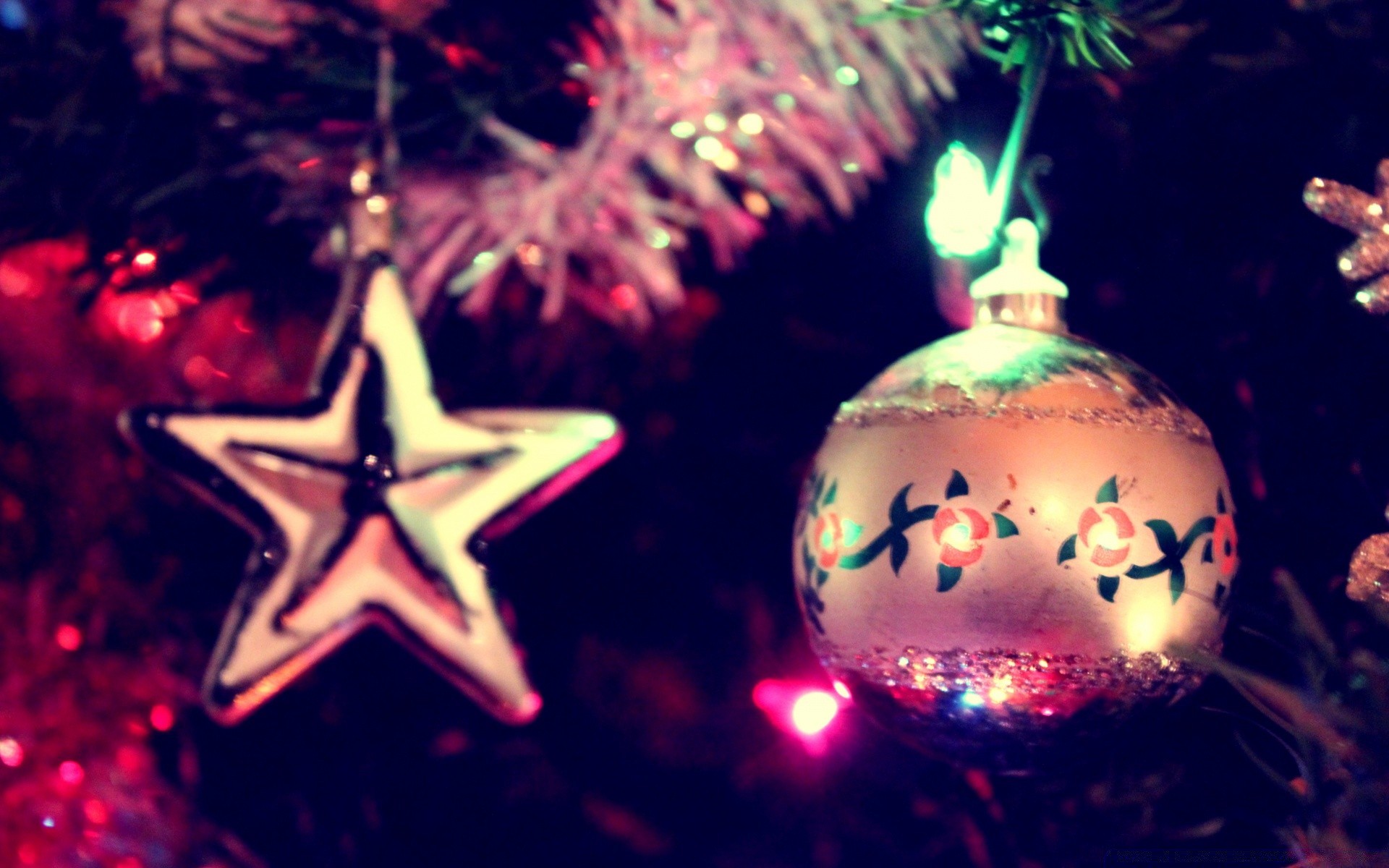 Weihnachtsschmuck. Stern, Lametta, Weihnachtsbeleuchtung