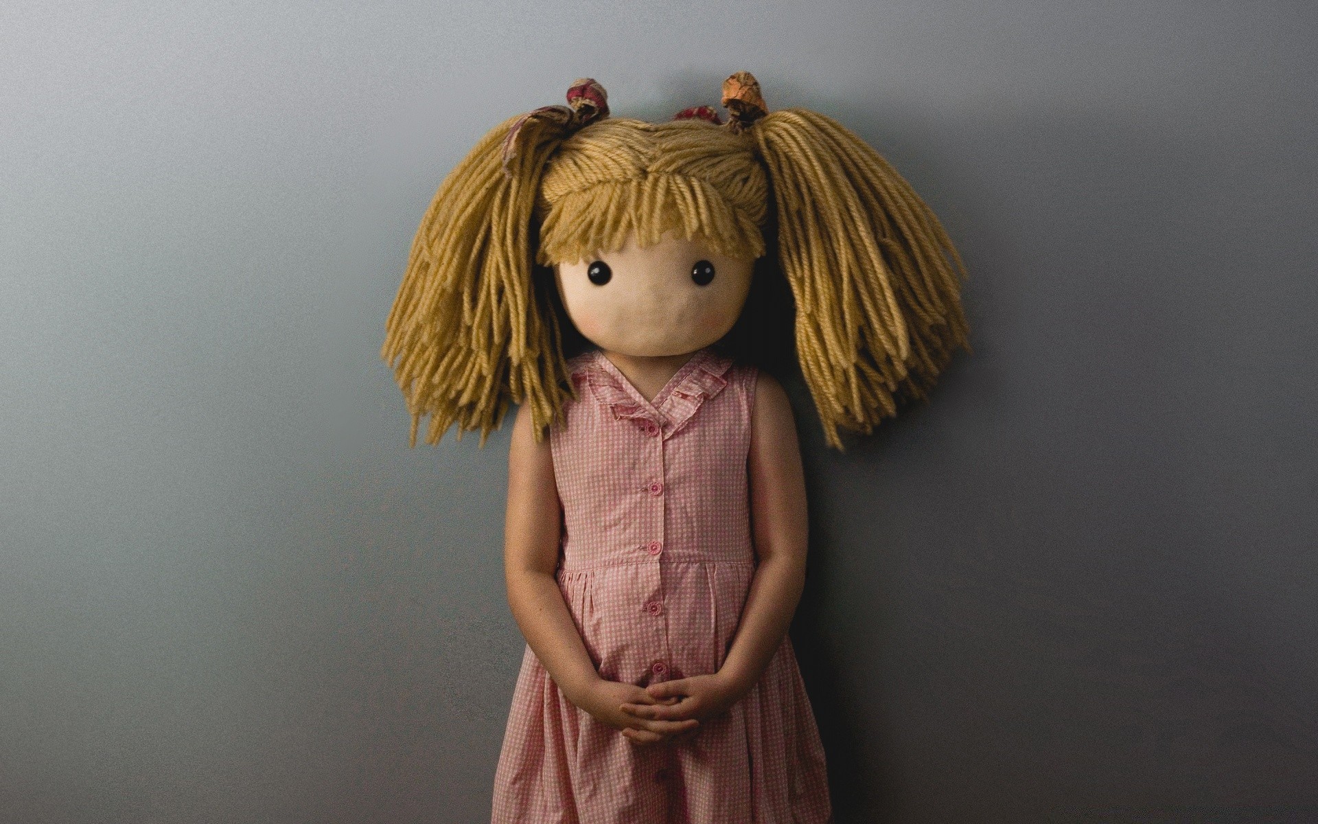 Porträt eines jungen Mädchens mit einem Puppenkopf
