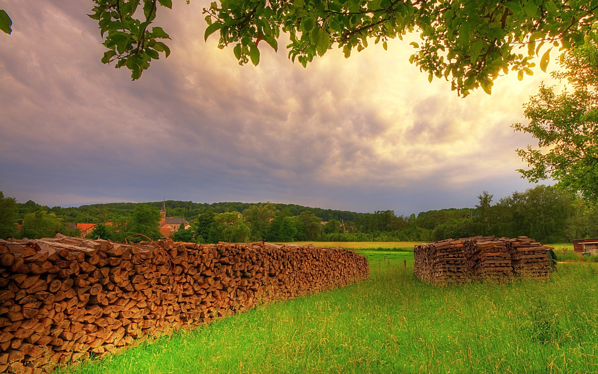 Düsterer Himmel über der Straße in einem Feld mit einem einsamen Baum