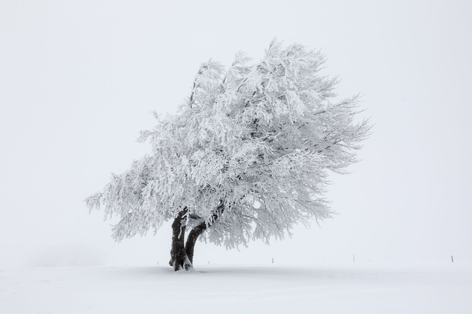 Toter nackter Baum bei Sonnenuntergang im Winterfeld