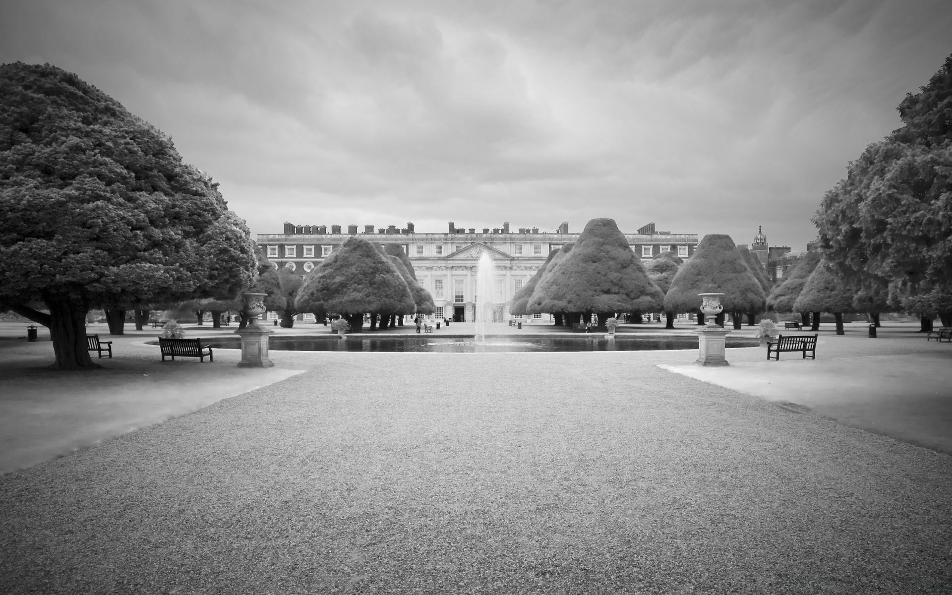 Altes Bibliotheksfoto mit blühendem Baum und Laterne