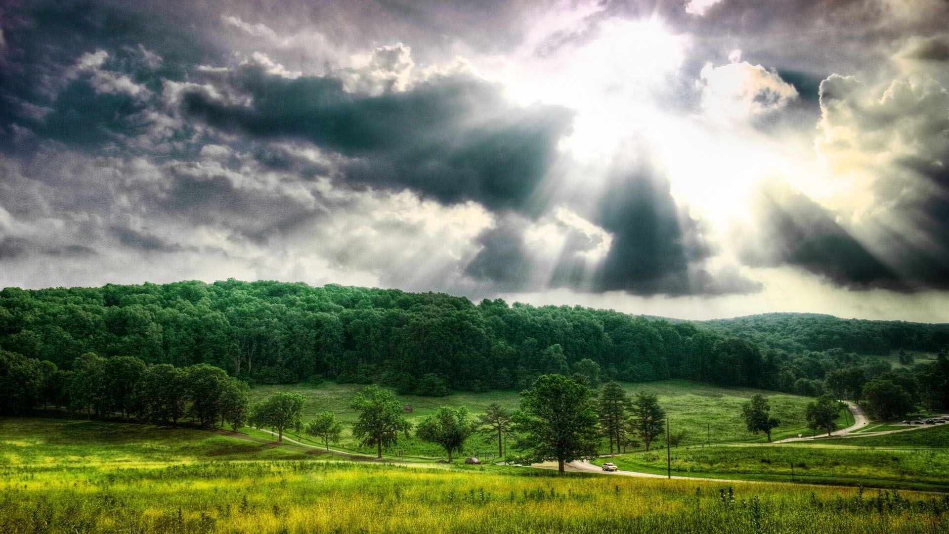 Graue Berge auf dem Hintergrund des gelben Himmels und des grünen Grases