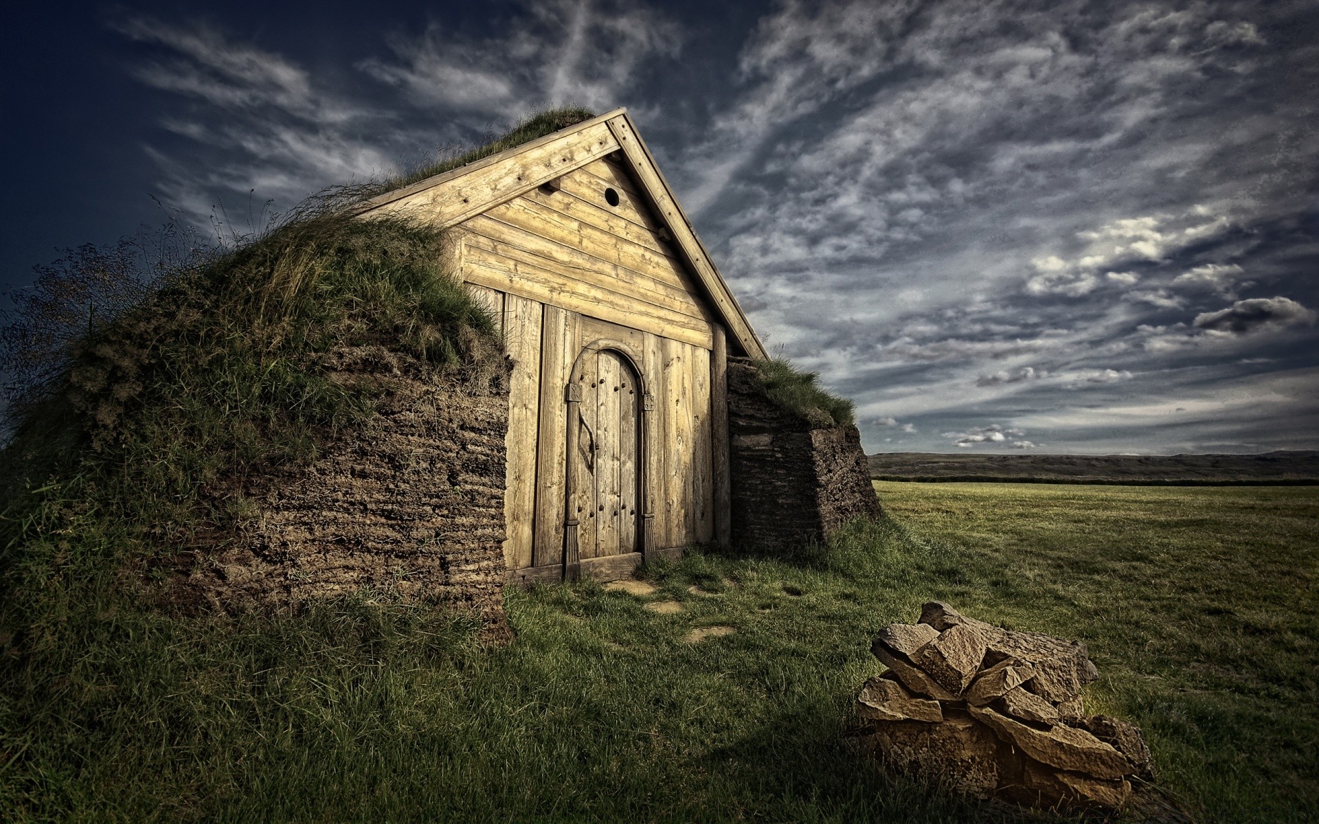 Altes Holzgebäude vor dem Hintergrund eines dunklen Himmels