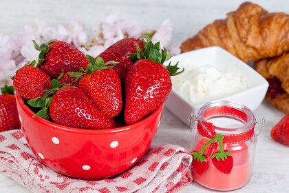 Schüssel mit Erdbeeren auf dem Tisch und Croissant