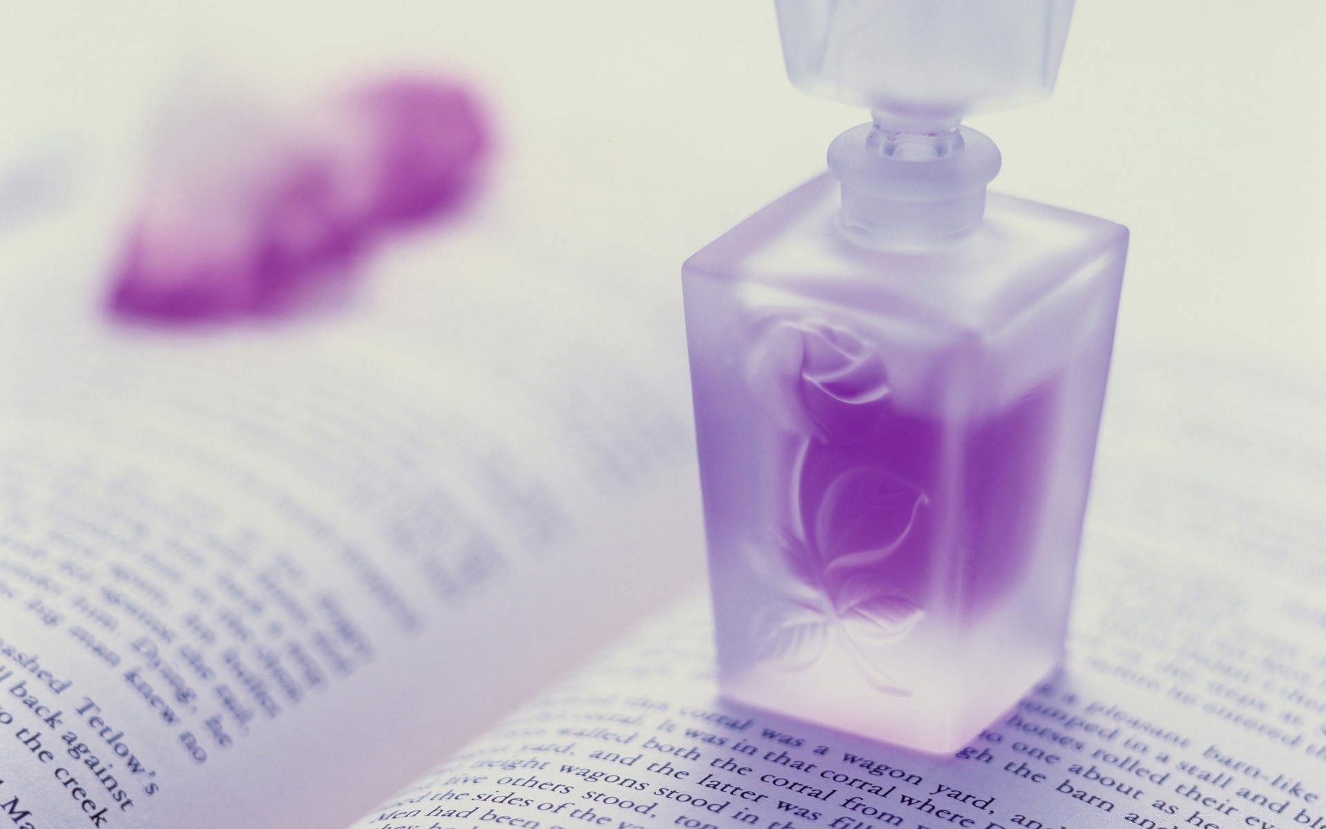 Eine Flasche mit einem violetten Parfüm auf einem geöffneten Buch