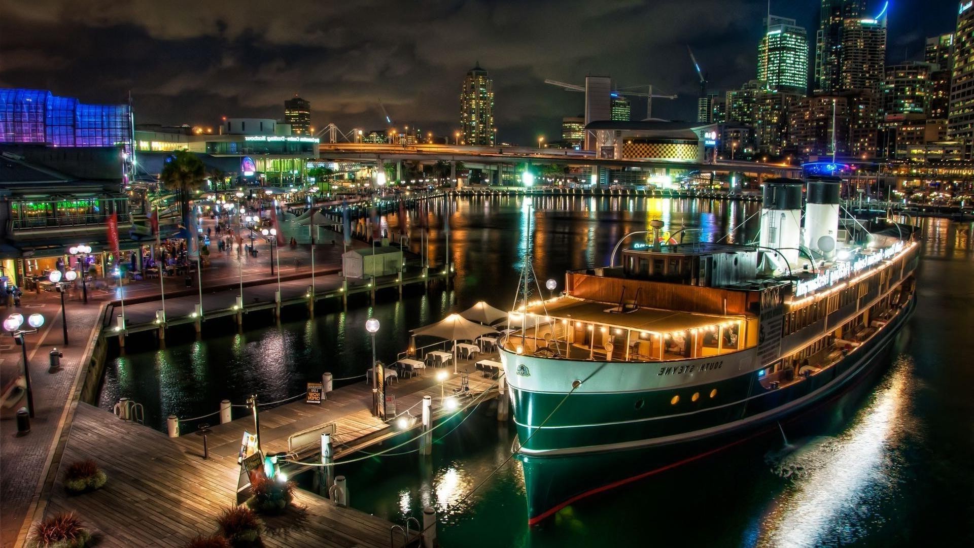 Nachtgrotte mit schöner Architektur auf dem Wasser