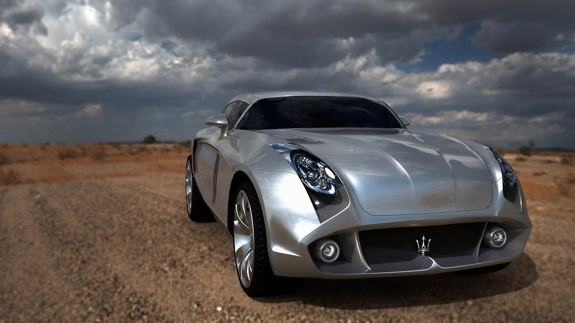 Ein silberner Sportwagen steht inmitten grüner Hügel auf der Straße