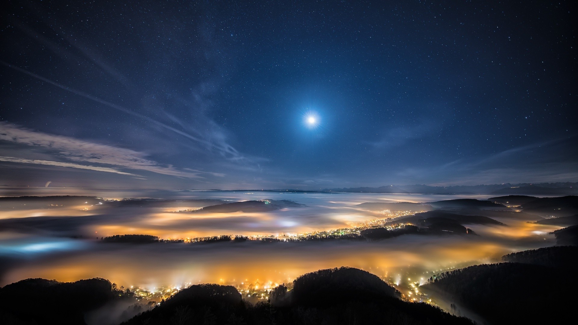 Weihnachtliche Winteratmosphäre von Häusern mit Weihnachtsbäumen