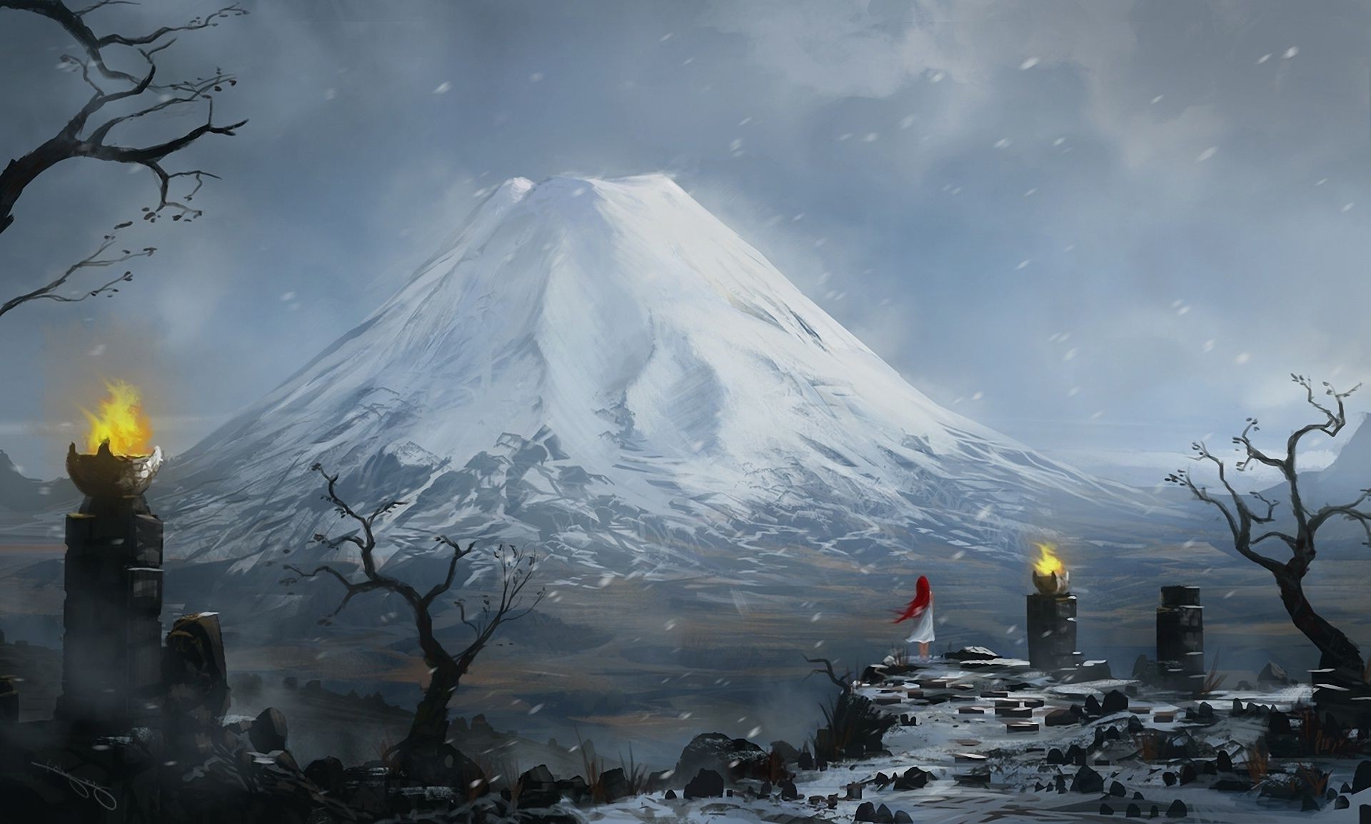 Silhouette eines Mannes auf einem Berg mit einem dunklen Strahl in den Himmel leuchtend